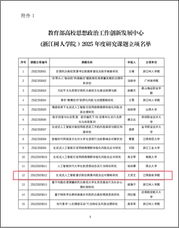 近日,教育部高校思想政治工作创新发展中心(浙江树人学院)公布了2025年度教育部高校思想政治工作创新发展中心(浙江树人学院)研究课题立项和预立项名单,由米兰官网思政课教师王灵芝教授主持的《生成式人工智能意识形态舆情风险及应对策略研究》课题获研究课题立项。
