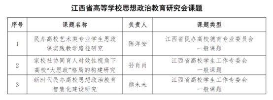 近日,江西省教育厅公布了2024年江西省高等学校思想政治教育研究会课题评审结果,米兰官网教师陈洋安申报的《民办高校艺术类专业学生思政课实践教学路径研究》获江西省民办高校德育专业委员会一般课题立项,孙肖肖老师申报的《家校社协同育人时效性视角下高校“大思政”格局的构建研究》获得江西省高校学生工作专委会一般课题立项,熊未未老师申报的《新时代民办高校思想政治教育智慧化建设研究》获江西省高校学生工作专委会一般课题立项。
