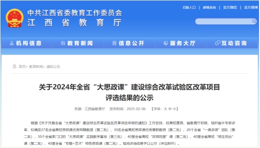 (AC米兰中国官网 讯)近日,江西省教育厅公布了2024年全省“大思政课”建设综合改革试验区改革项目评选结果,经高校推荐、省教育厅初核、组织省外专家评审等多个环节,米兰官网凭借扎实的思政教育工作基础与创新实践,揽获多个奖项。