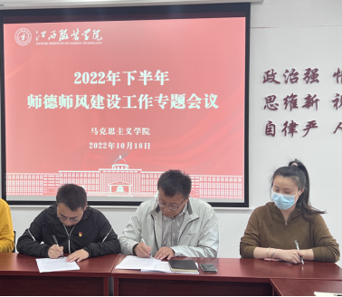 会议最后,新入职教师与学院院长肖杰、党总支副书记陈洋安签订师德师风承诺书,并公开承诺一定严格遵守十项准则,与全院教师一起打造德高风清的教学环境,做到为人师表,为培养德智体美劳全面发展的时代新人做出贡献。