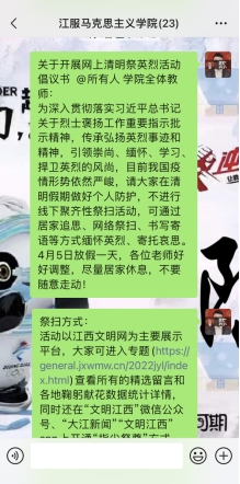 在活动开展前期,学院向全体发出倡议,在疫情期间不进行线下祭扫,倡导文明祭扫,号召全体教师党员通过江西文明网、“文明江西”微信公众号、“大江新闻”“文明江西”app等网络平台,参加网上祭英烈活动,在网上进行默哀致敬、敬献花圈和活动留言。4月5日,大家通过学习强国平台参加网上祭英烈活动。无论是在革命战争时期、改革发展时期、还是步入新时代,总有一群人抛头颅、撒热血,为人民幸福、为民族独立、为祖国繁荣富强牺牲了生命。他们用不朽的精神丰碑,为我们留下深厚的红色印记。