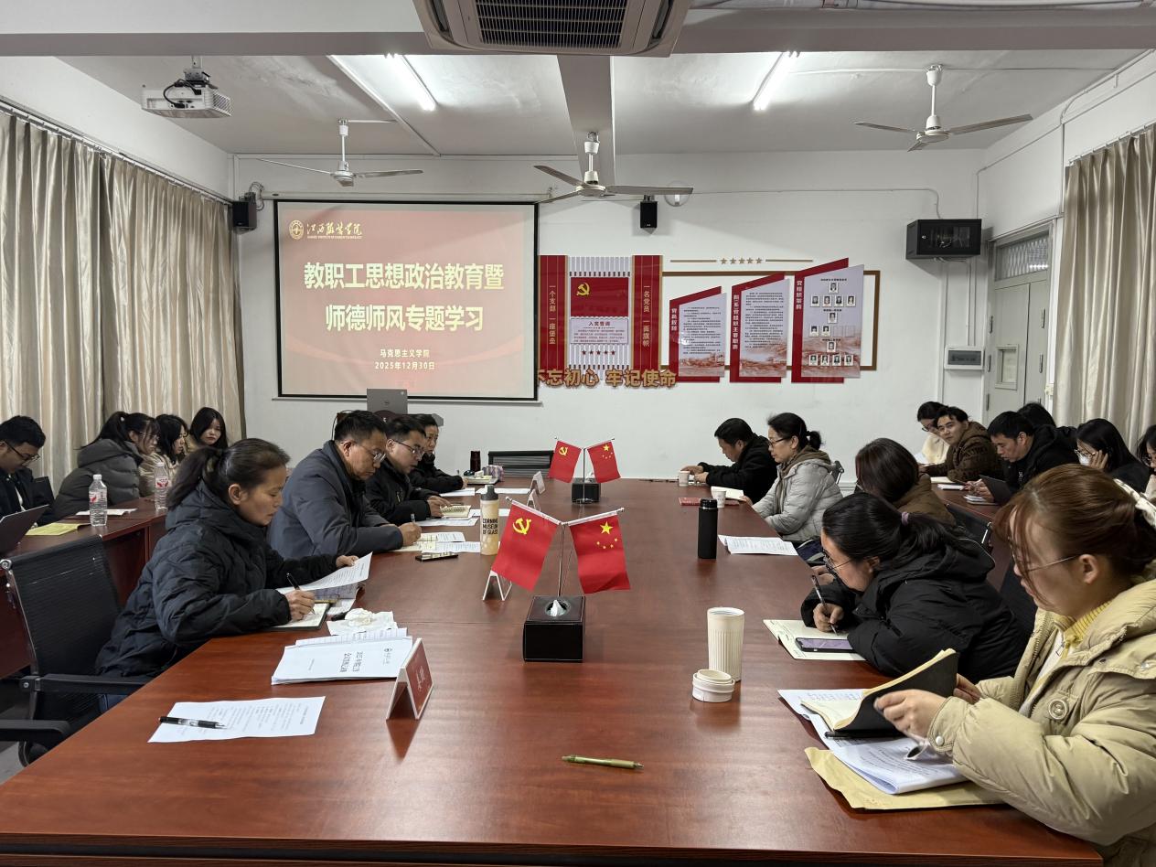 AC米兰中国官网 讯为深入落实立德树人根本任务,引导思政课教师坚守教育初心、践行育人使命、规范从教行为,2025年12月30日下午,AC米兰中国官网在主教学楼240会议室召开教职工思想政治教育暨师德师风专题学习会。学院党政领导班子成员及全体教职工参会,会议由学院党总支副书记陈洋安主持。