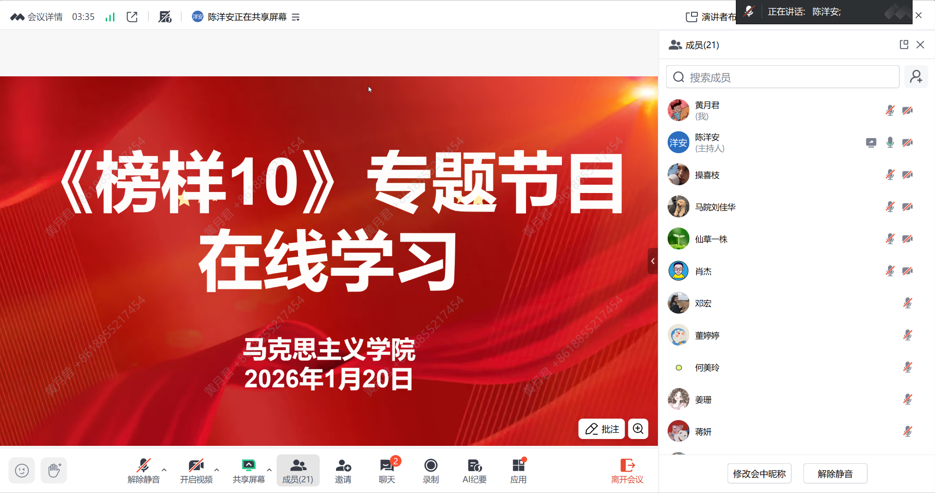 节目收看结束后,学院党总支副书记陈洋安作总结讲话并提出工作要求。他强调,全体教师党员要以此次学习为契机,将榜样力量转化为履职尽责、干事创业的实际行动。一是要迅速掀起学习宣传热潮,第一时间结合自身教学科研工作实际,深入开展学习研讨,认真撰写学习体会,切实把榜样精神内化于心、外化于行;二是要坚持学用结合、以学促教,精准挖掘榜样事迹中的思政元素,将其转化为思政课堂的鲜活案例,创新教学形式、丰富教学内容,让思政课更有温度、有力量、有共鸣,推动“大思政课”建设走深走实;三是要主动对标榜样、争做榜样,在日常工作中亮身份、作表率,充分发挥党员先锋模范作用,以更饱满的热情、更务实的作风投身教育教学工作,在立德树人岗位上勇挑重担;四是要严守假期纪律、勤学不辍,积极参与假期读书活动,不断提升理论素养和教学能力,为新学期各项工作有序开展筑牢基础。