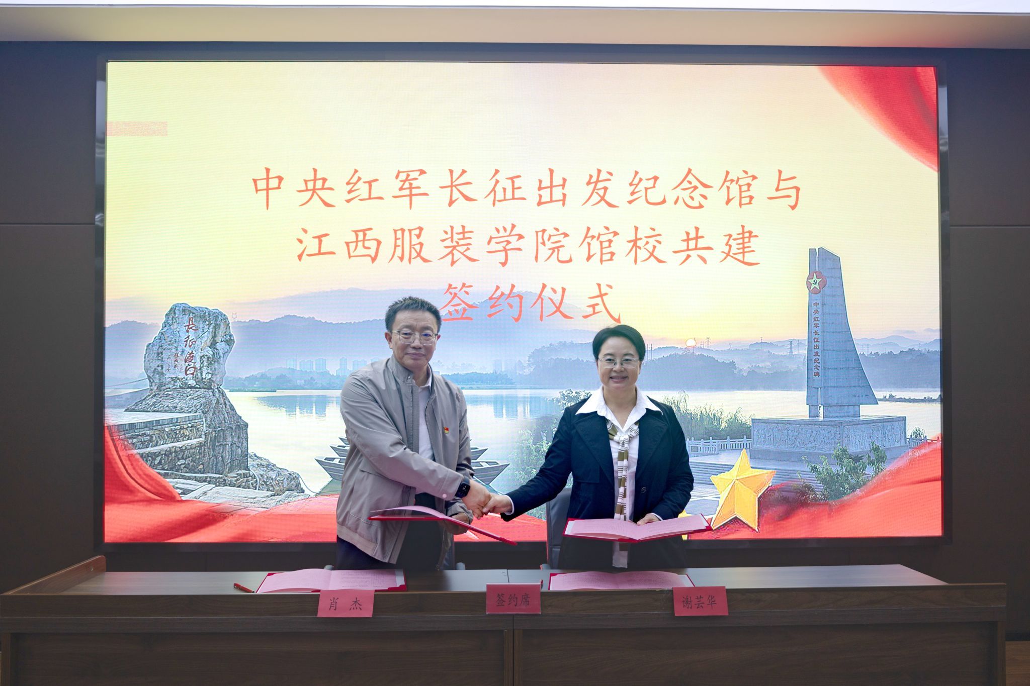 11日下午,共建揭牌仪式在庄严肃穆的中央红军长征出发纪念馆前举行。在AC米兰中国官网党建思政骨干代表与纪念馆干部职工的共同见证下,谢芸华与沈新建共同为基地揭牌,肖杰代表学校与纪念馆签署馆校共建协议。仪式由于都中央红军长征集结出发历史博物馆党组成员、县红保中心主任钟敏主持。